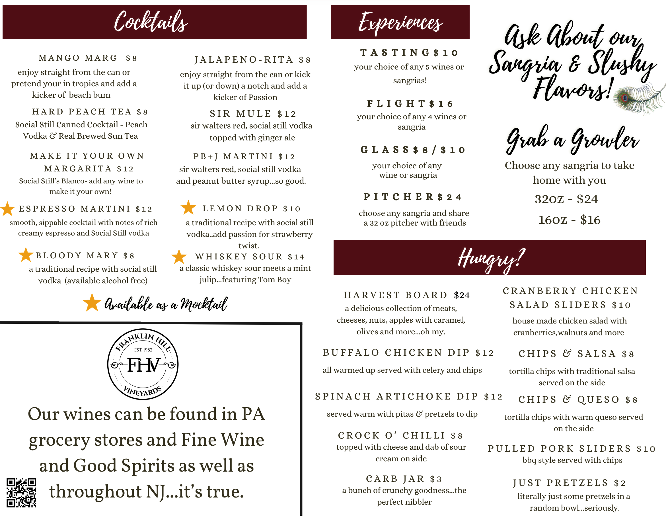 Come see where the painted skies meet the rolling hillside vineyards. Enjoy hand-crafted wines and fresh sangrias as you become one with the endless farmland and spectacular views of the Delaware River Valley. Meet some friends mid-week for a relaxing day under the pavilion, or swing by over the weekend for the live music, local brews, amazing cocktails, and some of the freshest bites around.